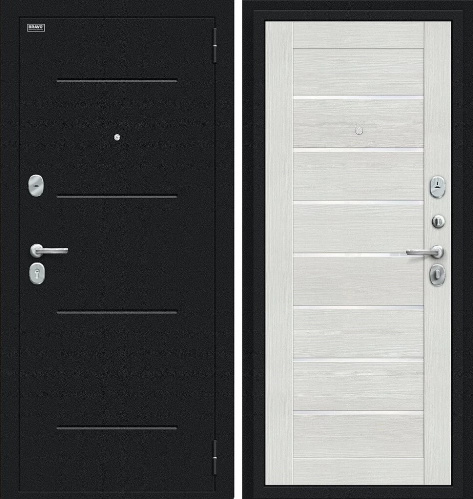 Надежная входная Дверь Браво Техно Букле черное/Bianco Veralinga премиум класса по цене 31 301 руб. Большая толщина стали защитит от проникновения в ваш дом, квартиру или коттедж. Используется очень качественная фурнитура: замки, цилиндры, ручки, защелки. Покрытие и отделка двери изготовлено под внимательным контролем производителя. Дверь имеет долгий срок службы и гарантию.